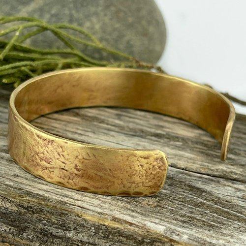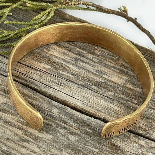 This solid brass bracelet is 6 inches long, and 1/2 inch wide. It is a solid 14 gauge brass bracelet that is comfortable to wear and perfect for every day.