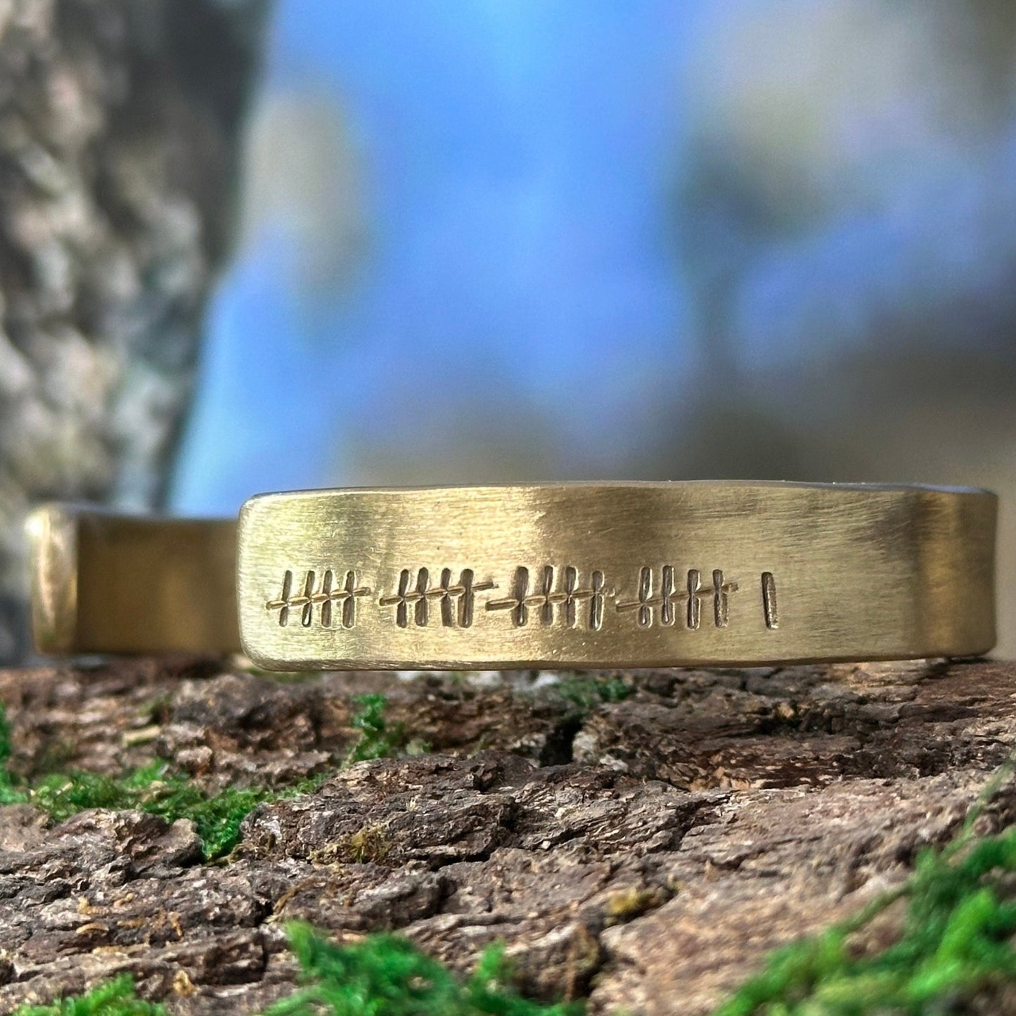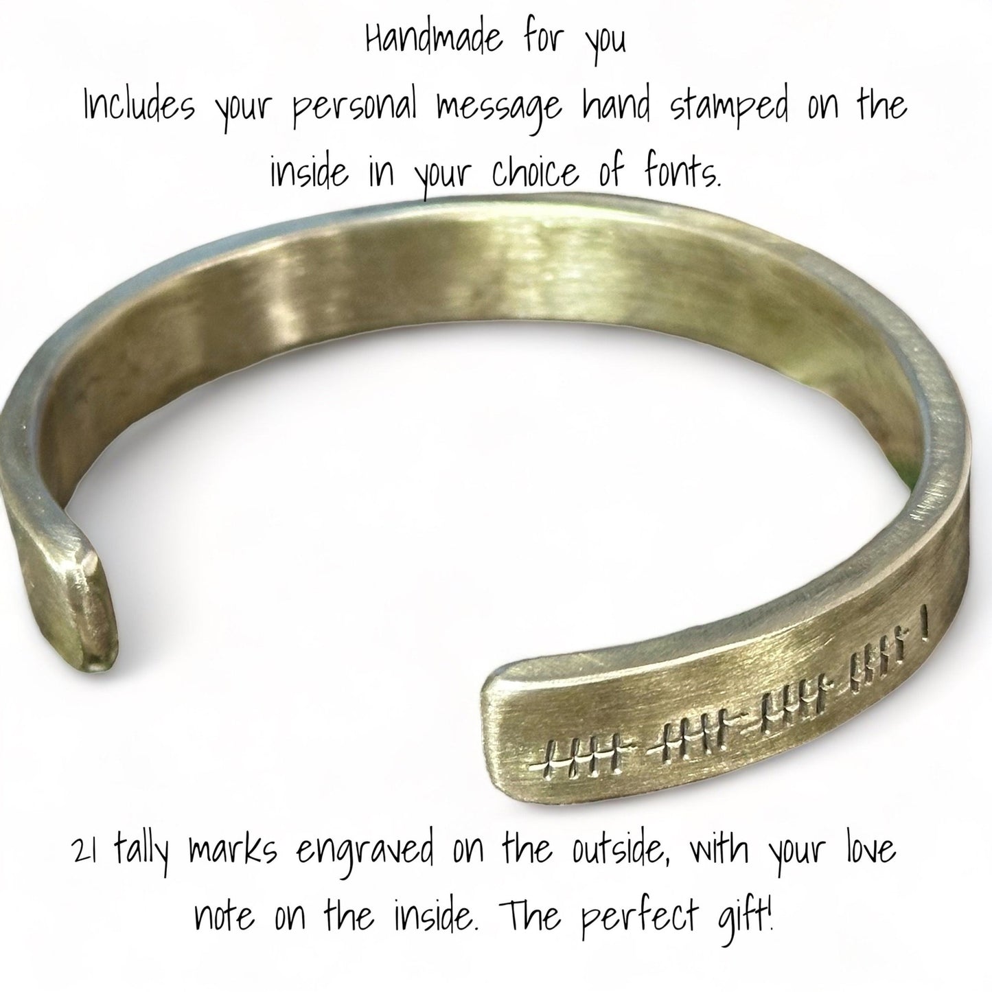 Celebrate 21 incredible years together with a gift as timeless as your love! This solid brass cuff bracelet features 21 hand-engraved tally marks on the outside, commemorating your journey together. On the inside, a custom love note is hand-stamped to make this piece uniquely yours—because 21 years deserves more than just a card.