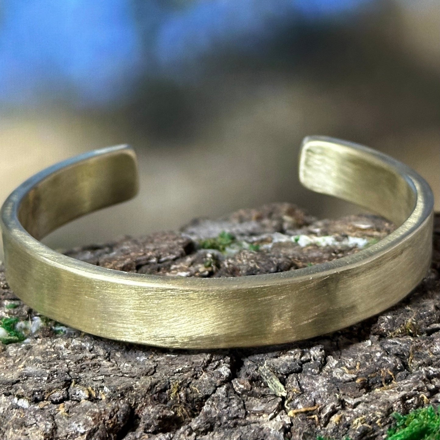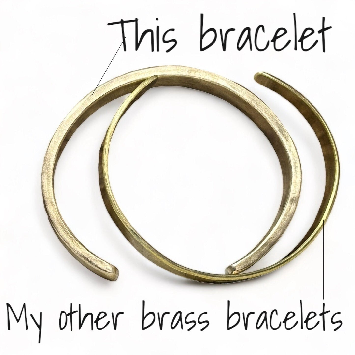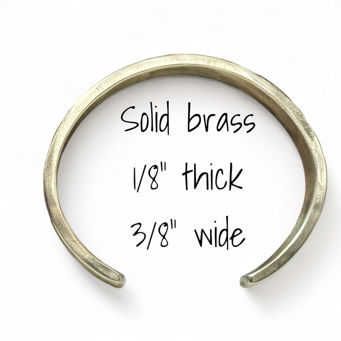 Crafted from solid brass, this 6-inch cuff is 3/8 inch wide and 1/8 inch thick, striking the perfect balance between durability and everyday comfort. Its golden hue radiates warmth, just like your relationship. And yes, the brass may leave a green tint on the skin—it’s like a quirky love mark, but don’t worry, it washes off easily. Prefer to avoid it? Add a layer of clear nail polish, or let me apply it for you before shipping.