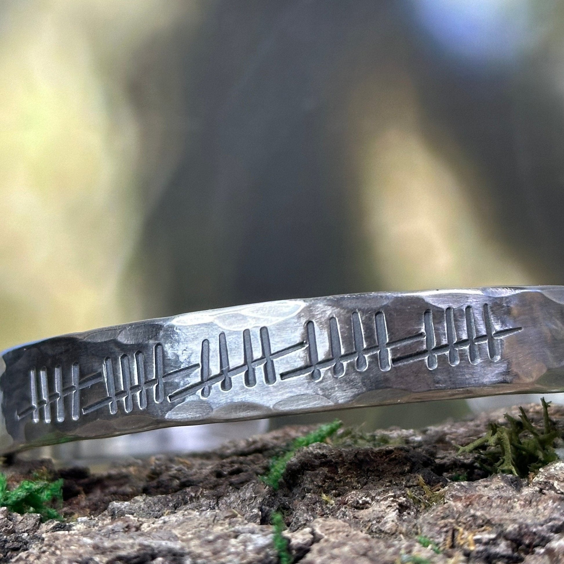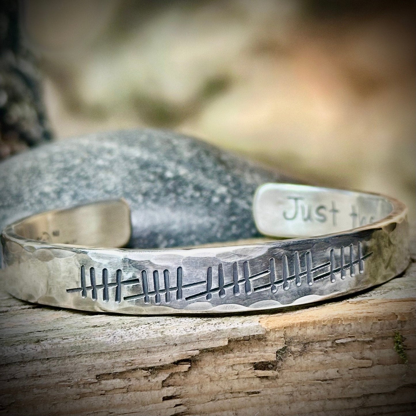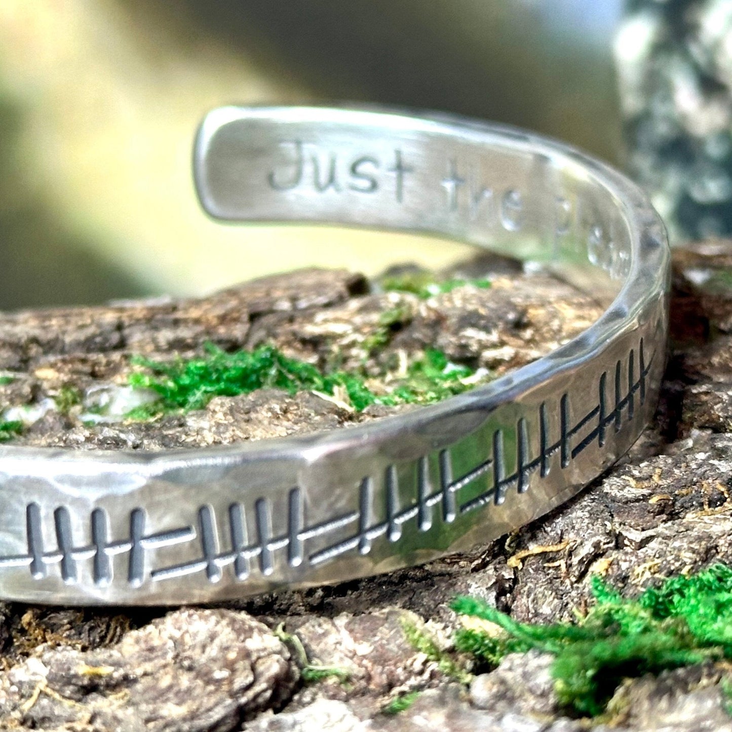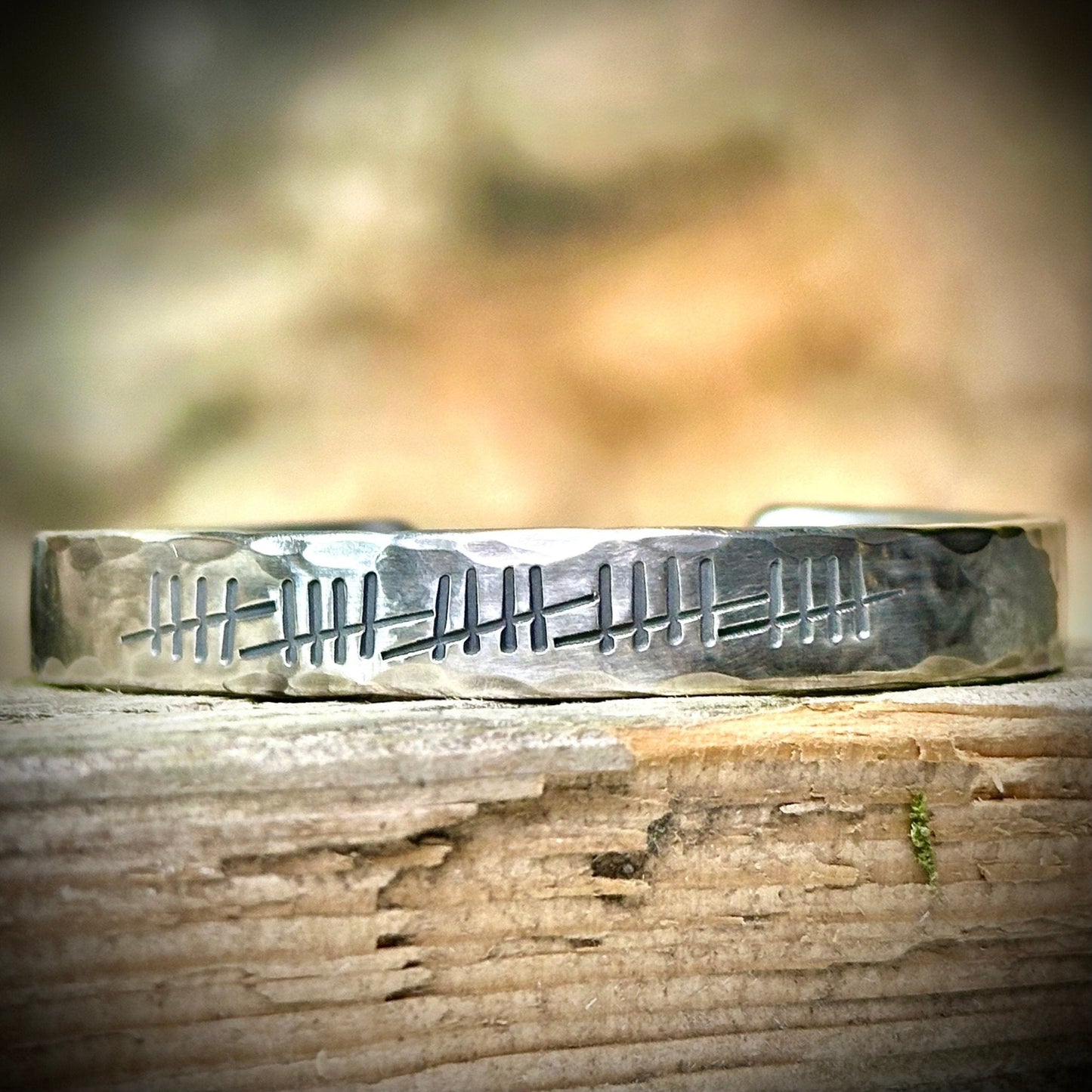 • Thickest silver I can find (3.2mm solid sterling silver with 25 hand-stamped tally marks on the front, 9.5mm wide)