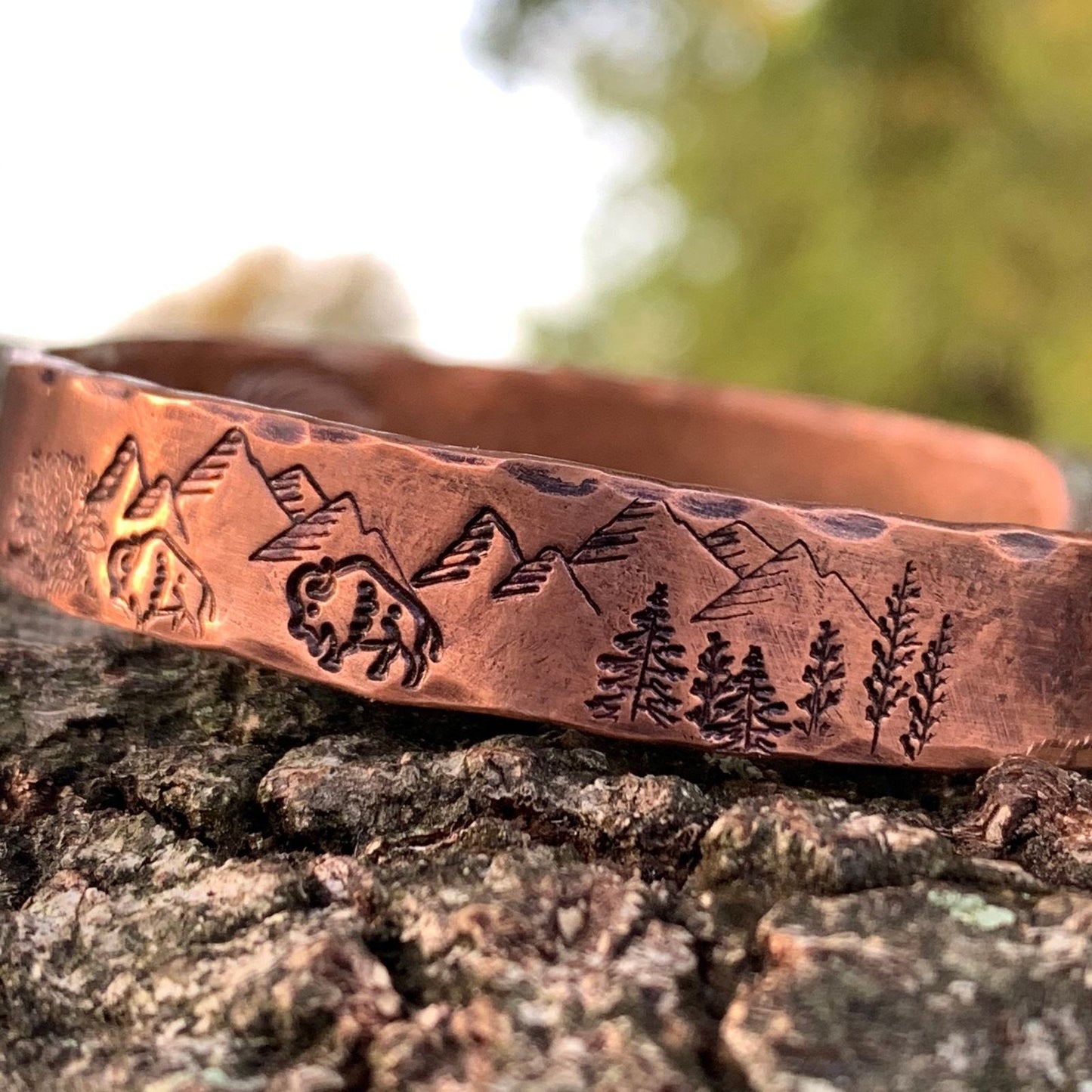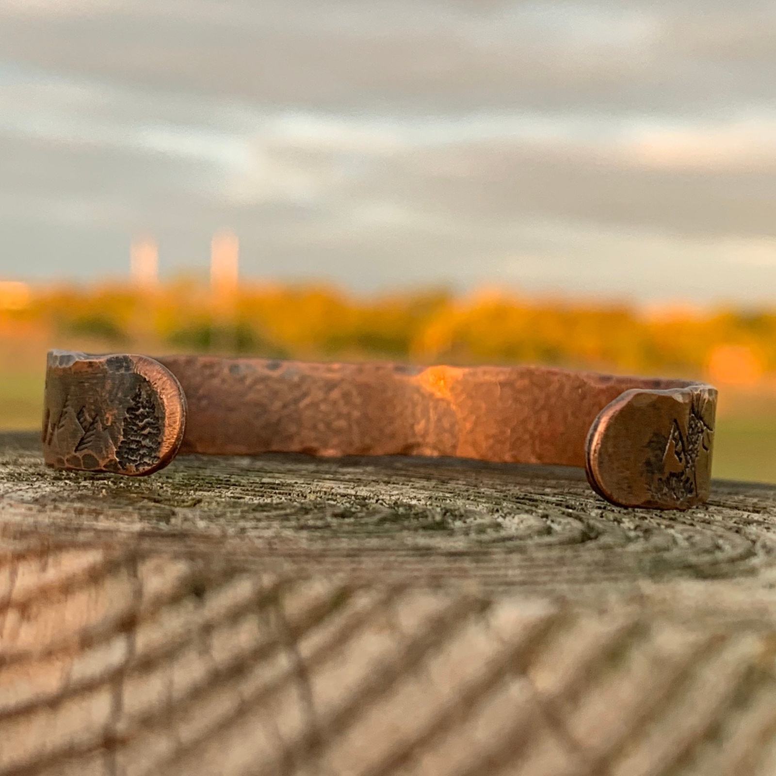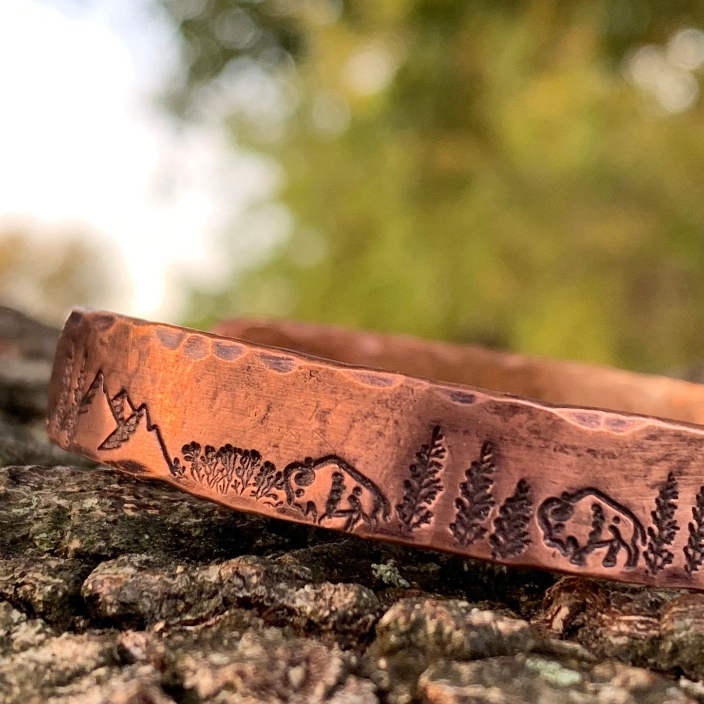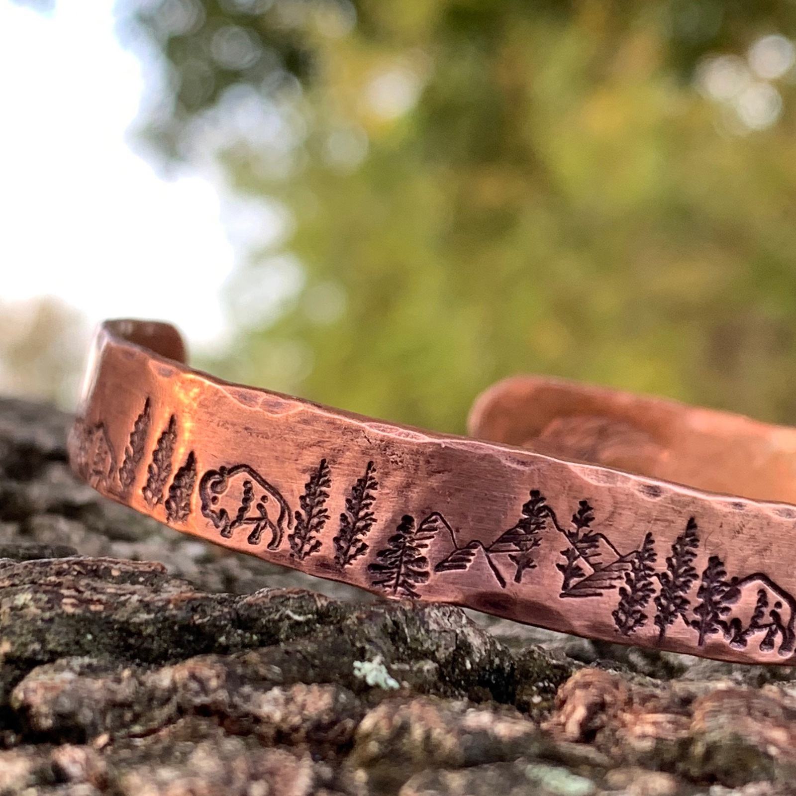 This engraved copper bracelet is hand forged and finished with a hammered finish to give it a rustic look, perfect for men and women alike.