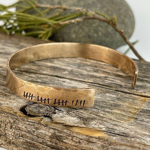 Celebrate 19 years together with this solid bronze cuff bracelet with hand engraved tally marks reflecting your 19th anniversary.