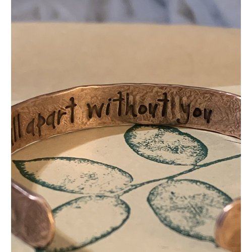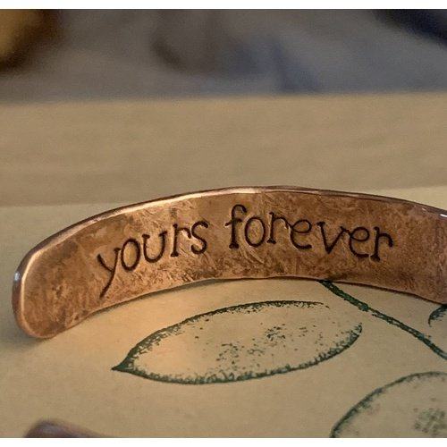 What an absolute beautiful piece of artwork the concrete copper bracelet is! Love it. The inscription inside came out lovely. Will order again from the kind artisan.