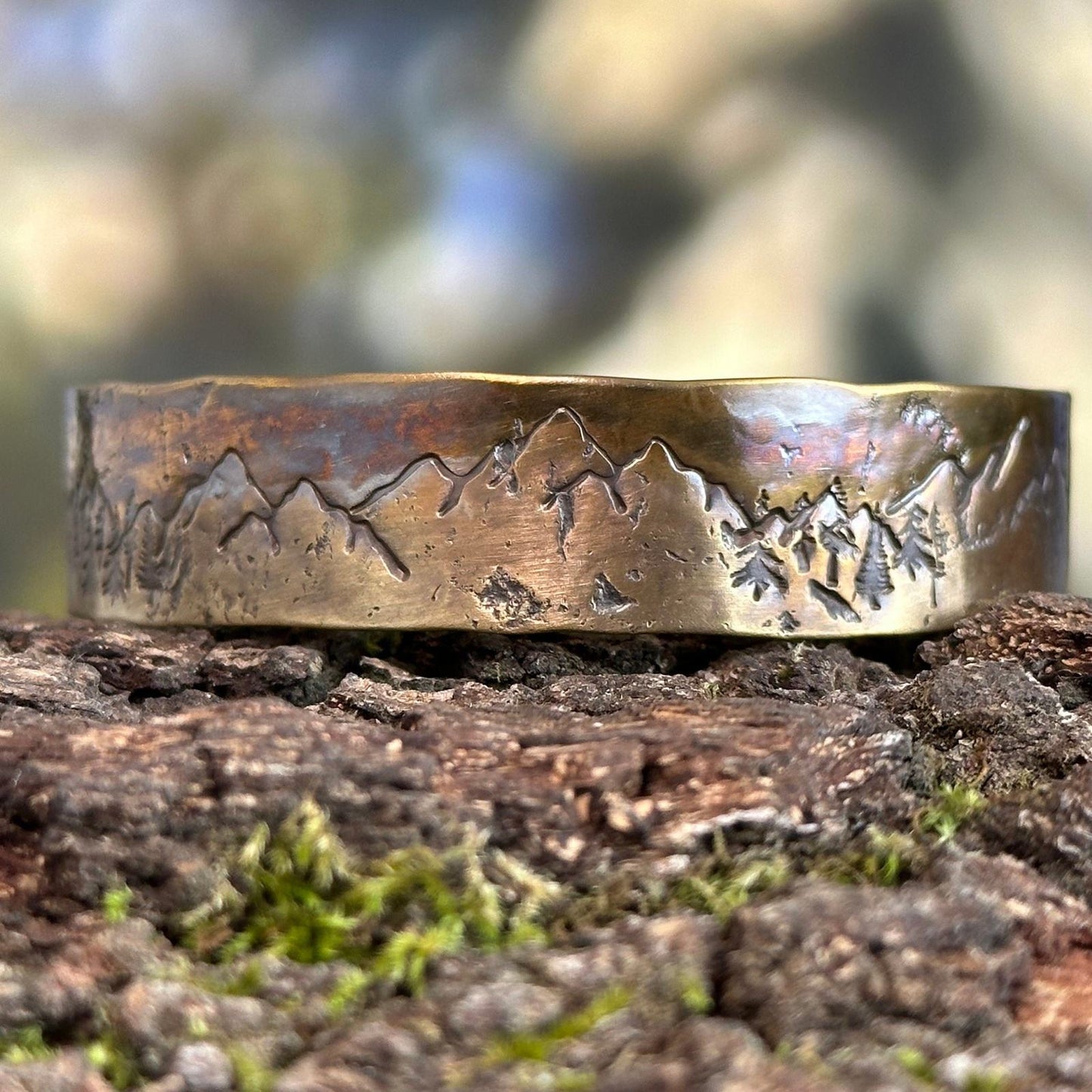 Seeking a special present? Look no further than this stellar bronze cuff bracelet! Perfect for birthdays or anniversaries, this bracelet is crafted out of solid bronze, which tradition says is the 8th and 19th anniversary gift. With forest-inspired mountains and trees carved into the metal, it's an ideal token for outdoor adventurers and nature-lovers. So show your loved one how much you appreciate them with this thoughtful gift!