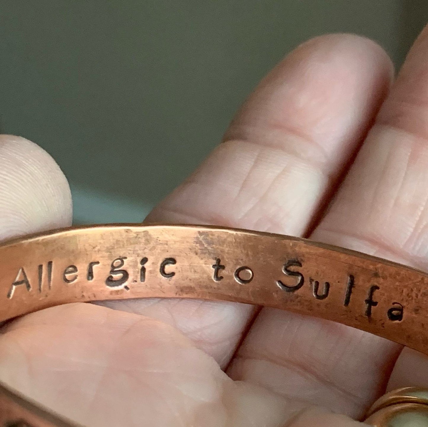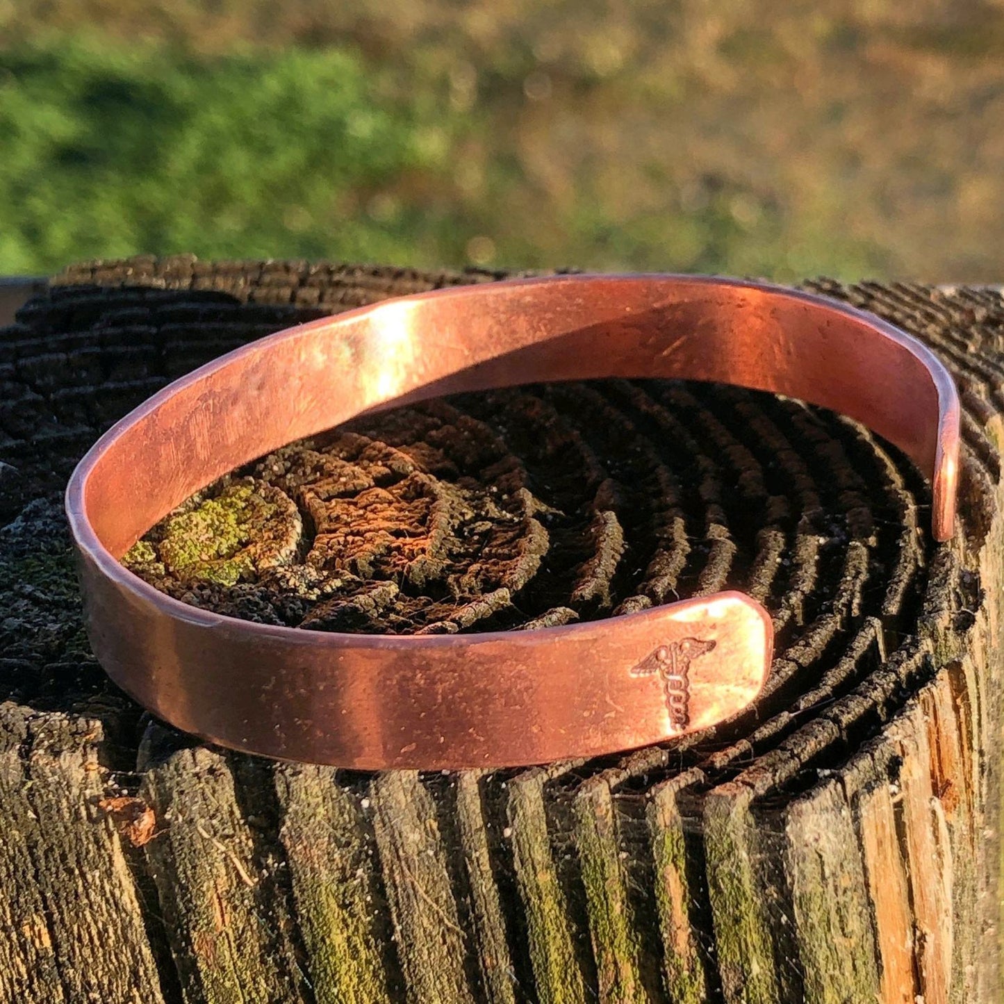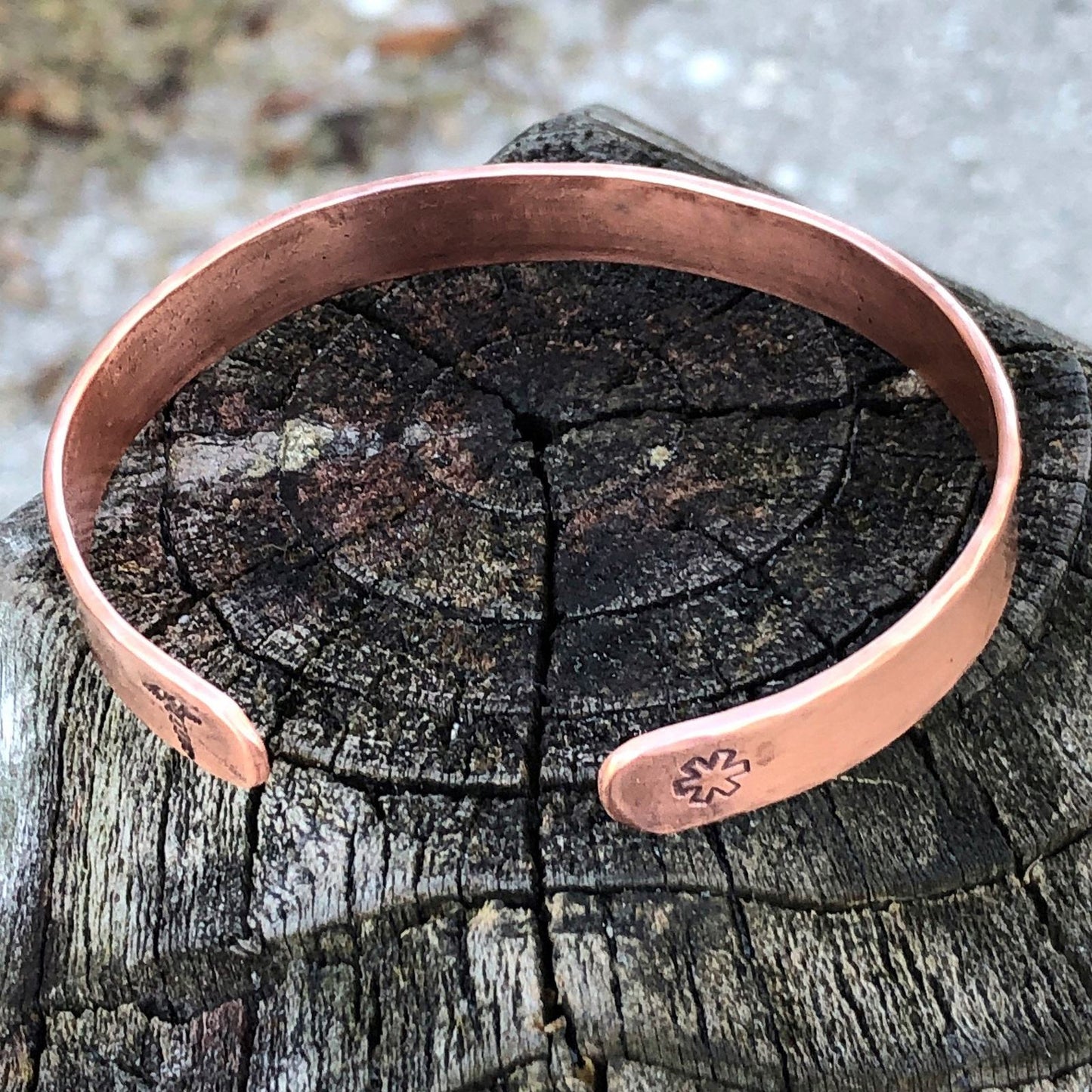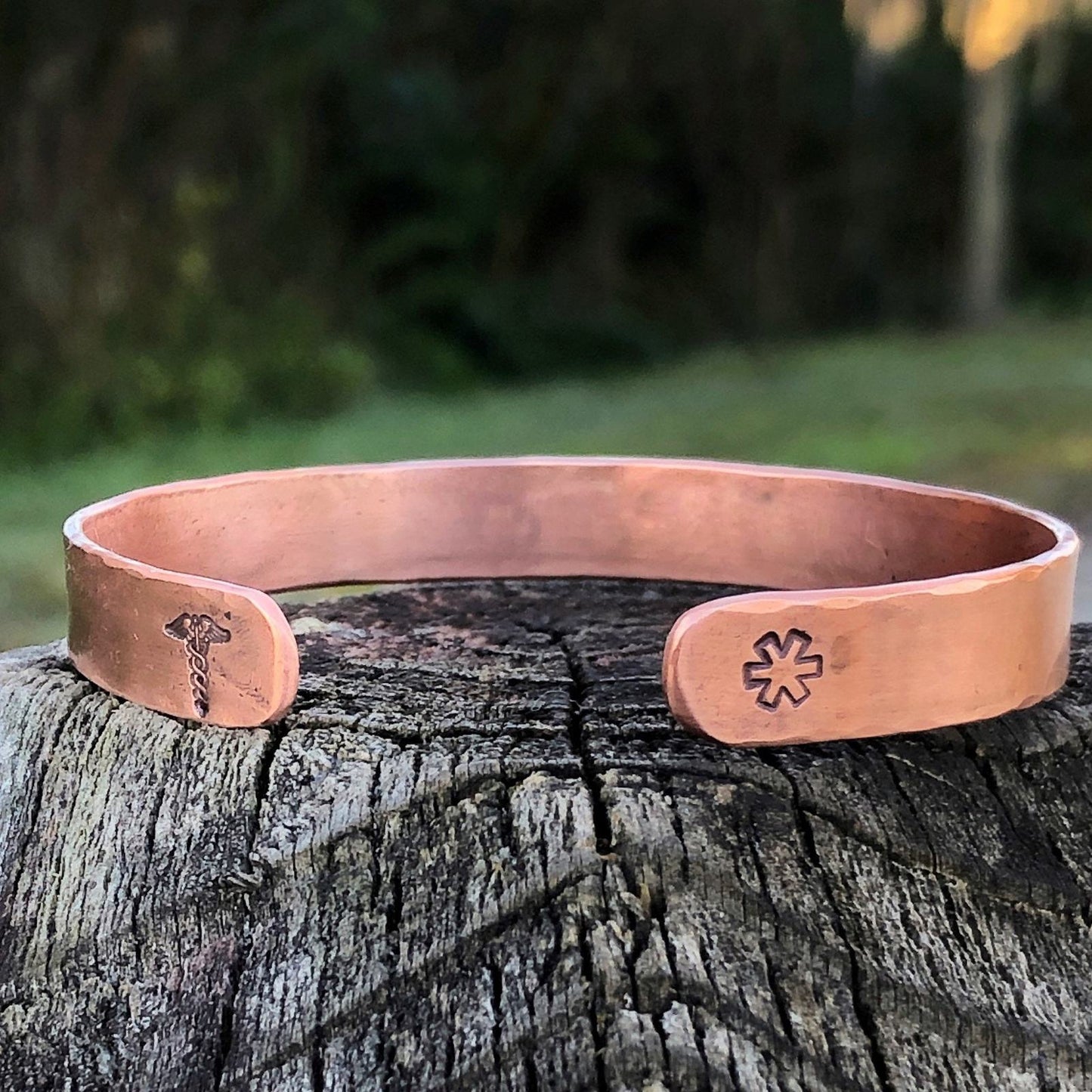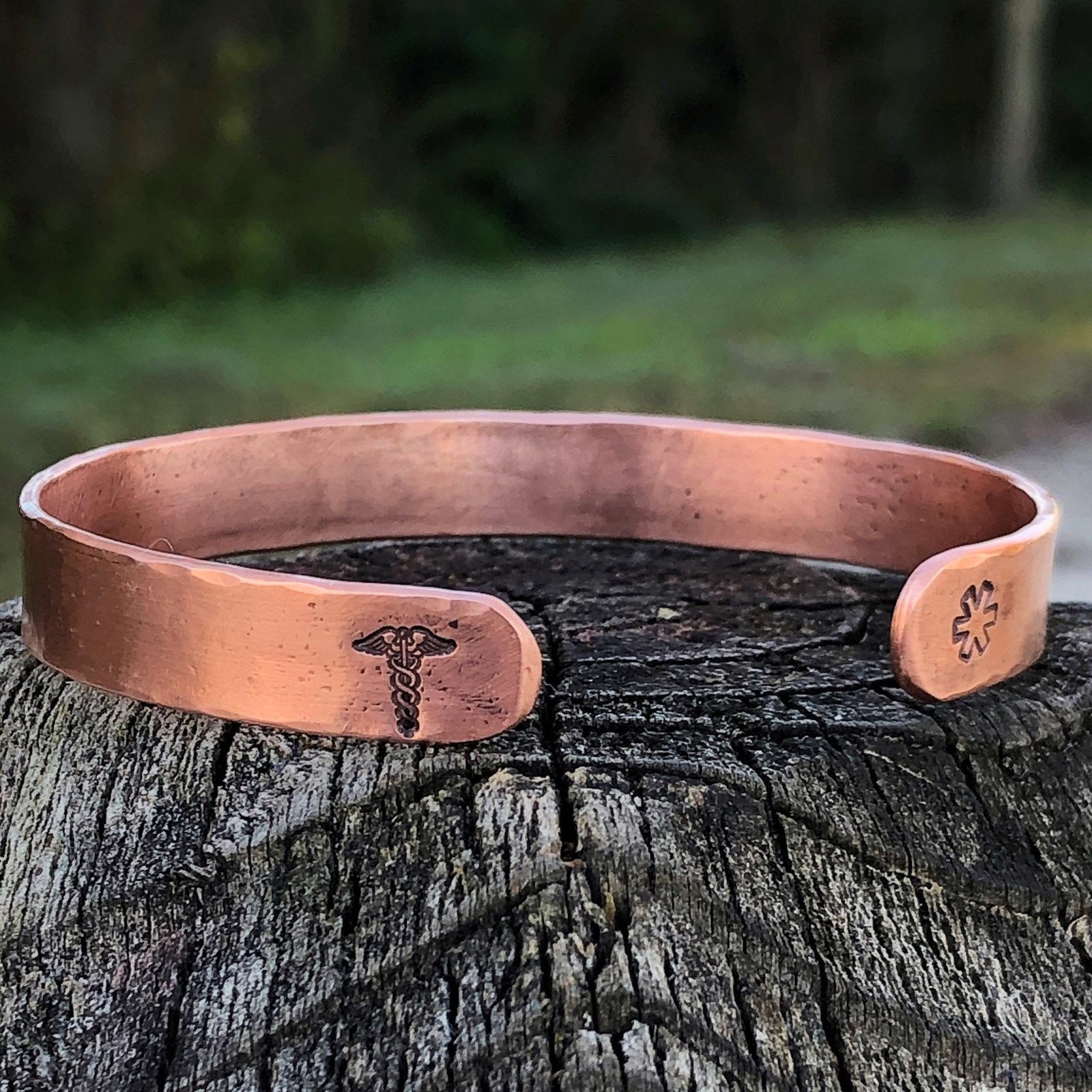 This hand forged, hand stamped copper cuff bracelet is the perfect way to notify people in an emergency that you have a medical need if you are not able to. The outside is stamped with the caduceus and medical alert shield.How to determine your size: