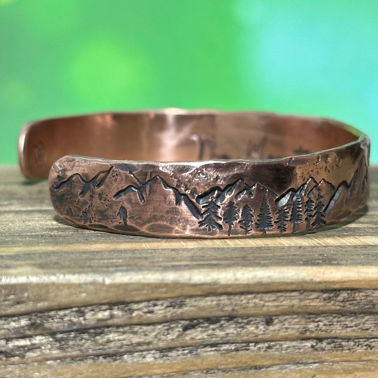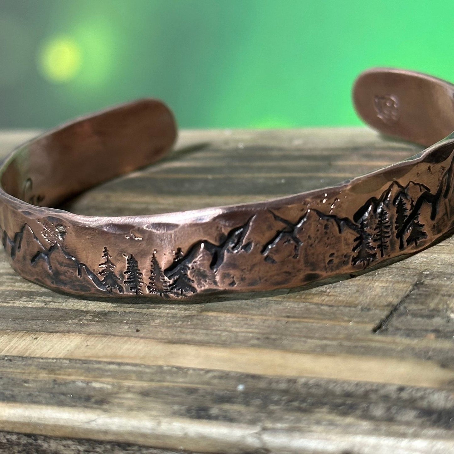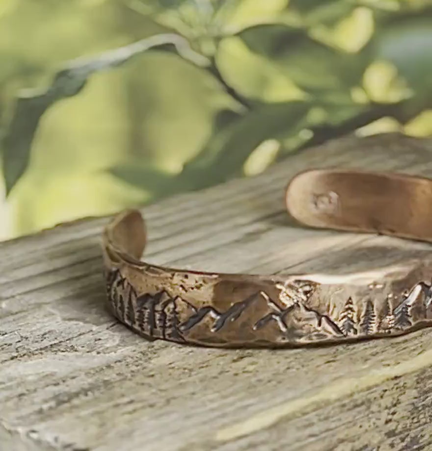 Wilderness Wonders: Custom Copper Cuff Bracelet with Mountain and Tree Designs