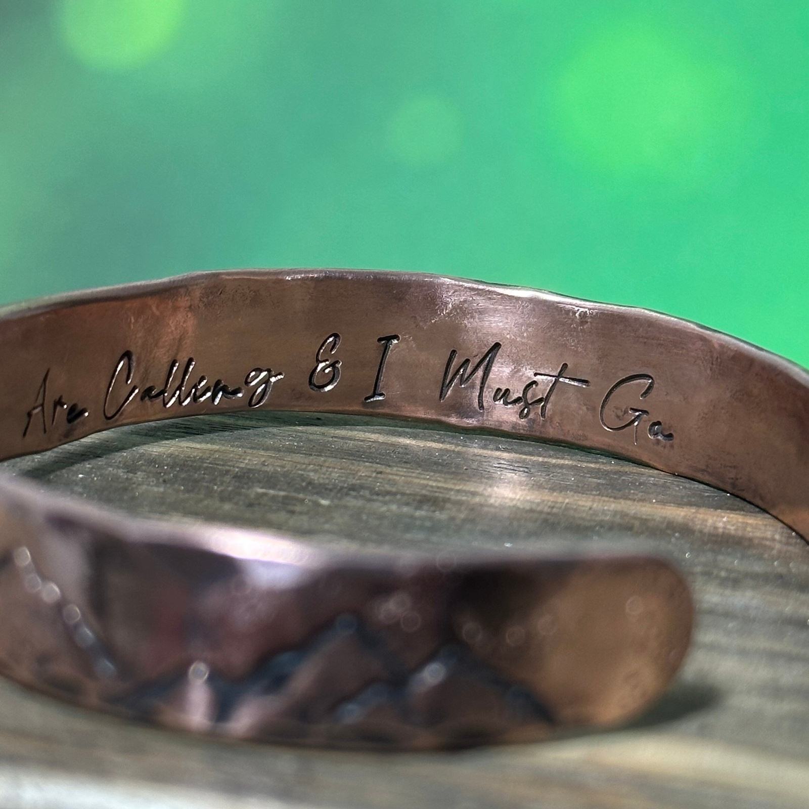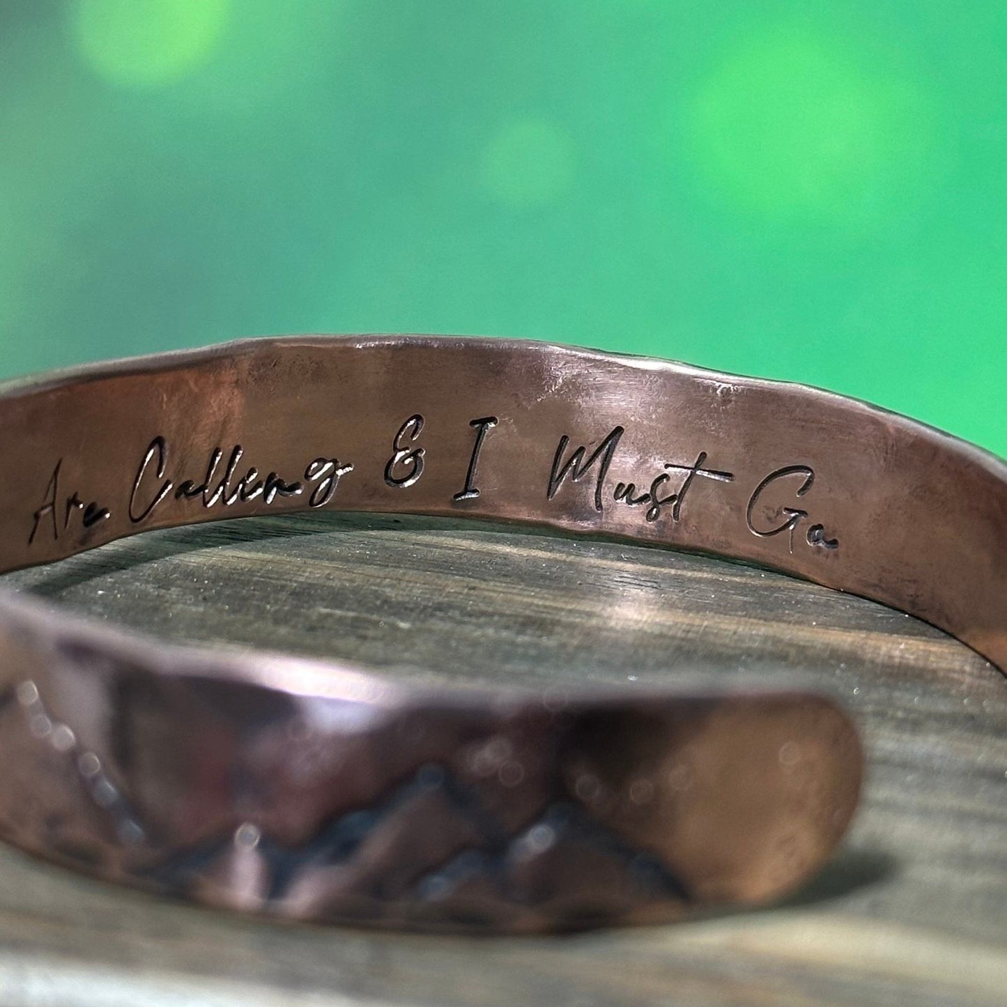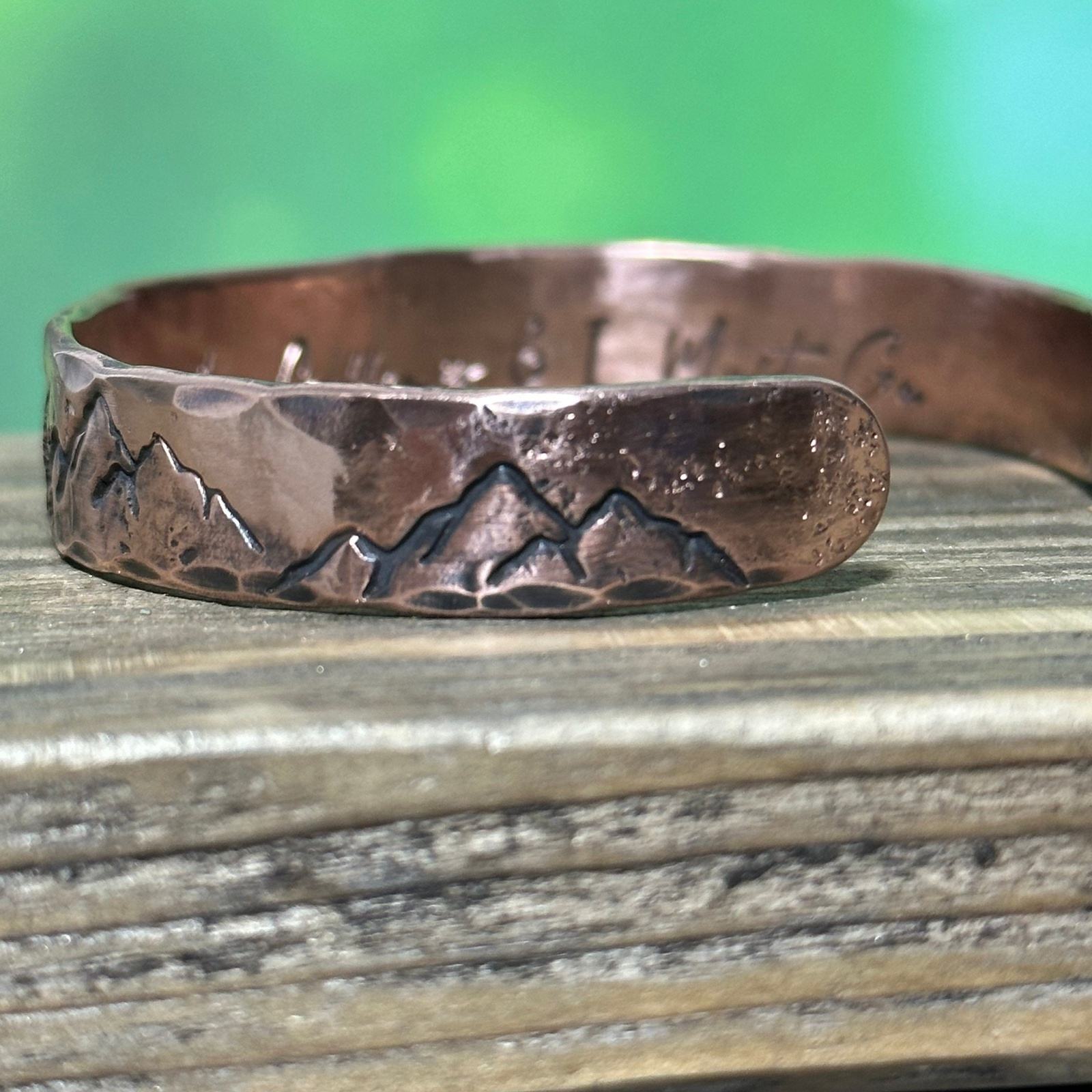 Wilderness Wonders: Custom Copper Cuff Bracelet with Mountain and Tree Designs