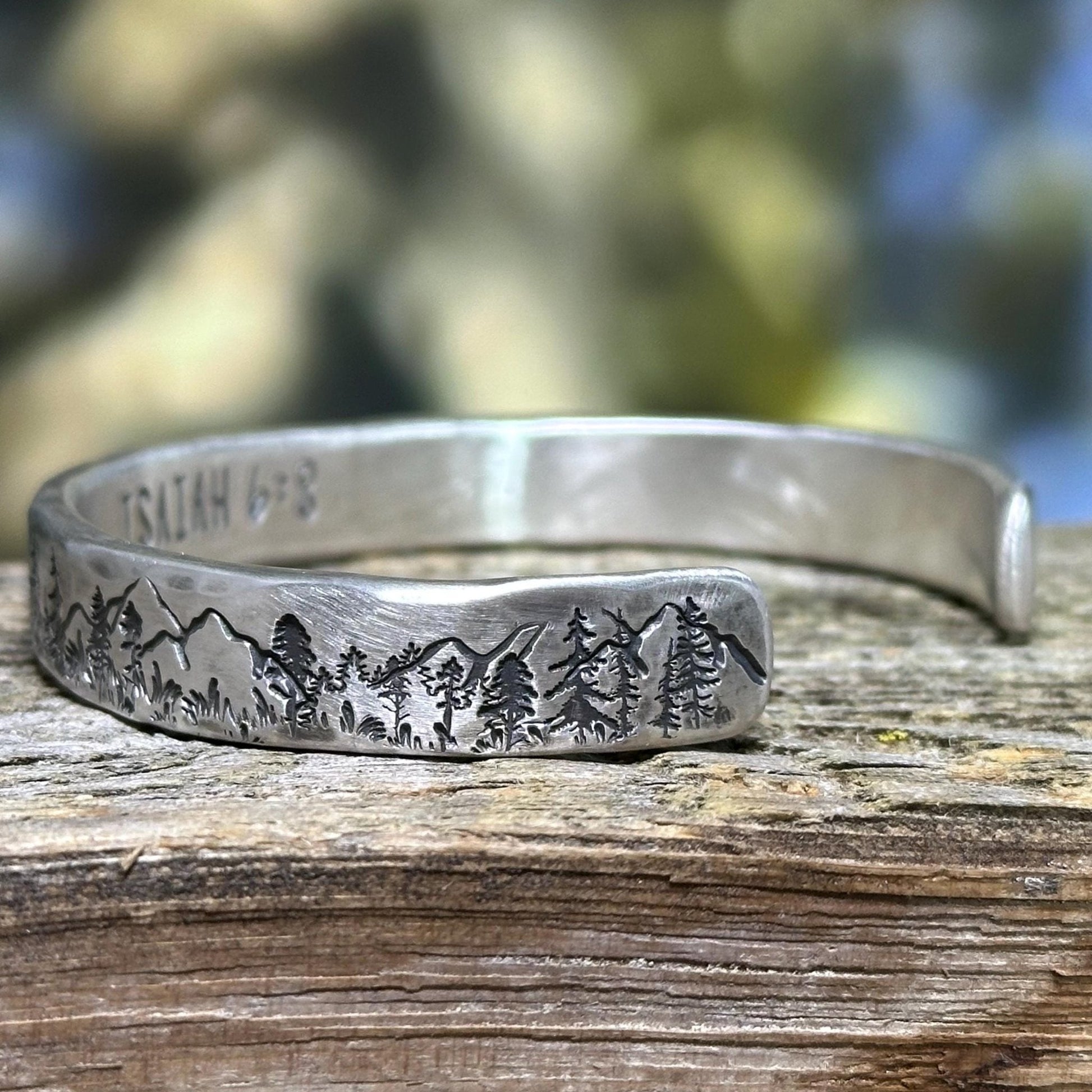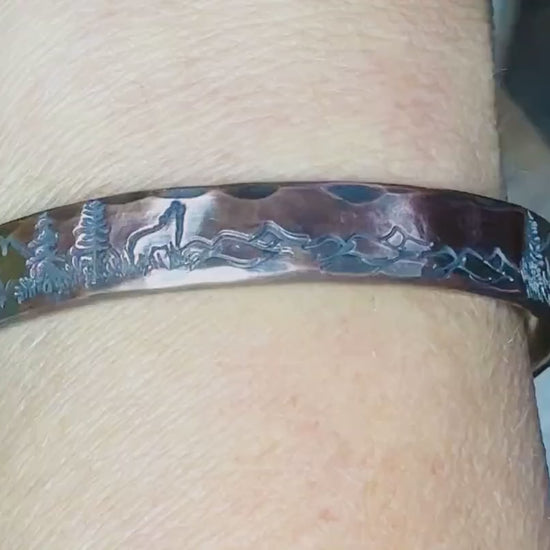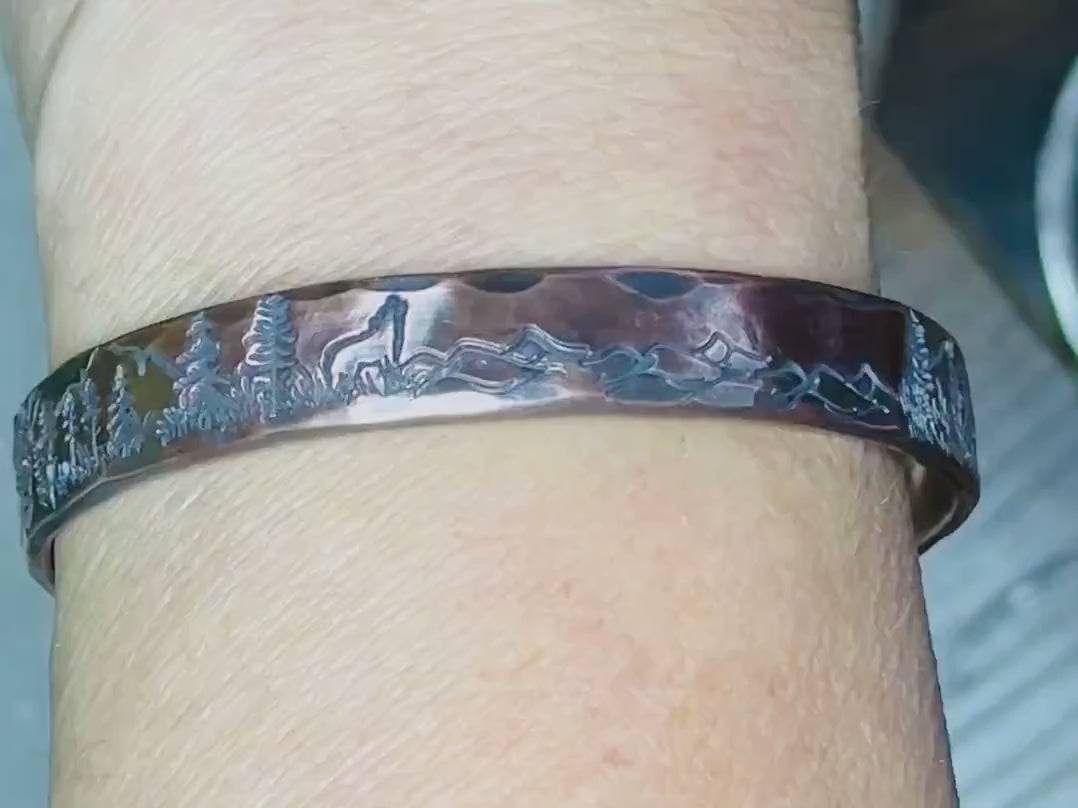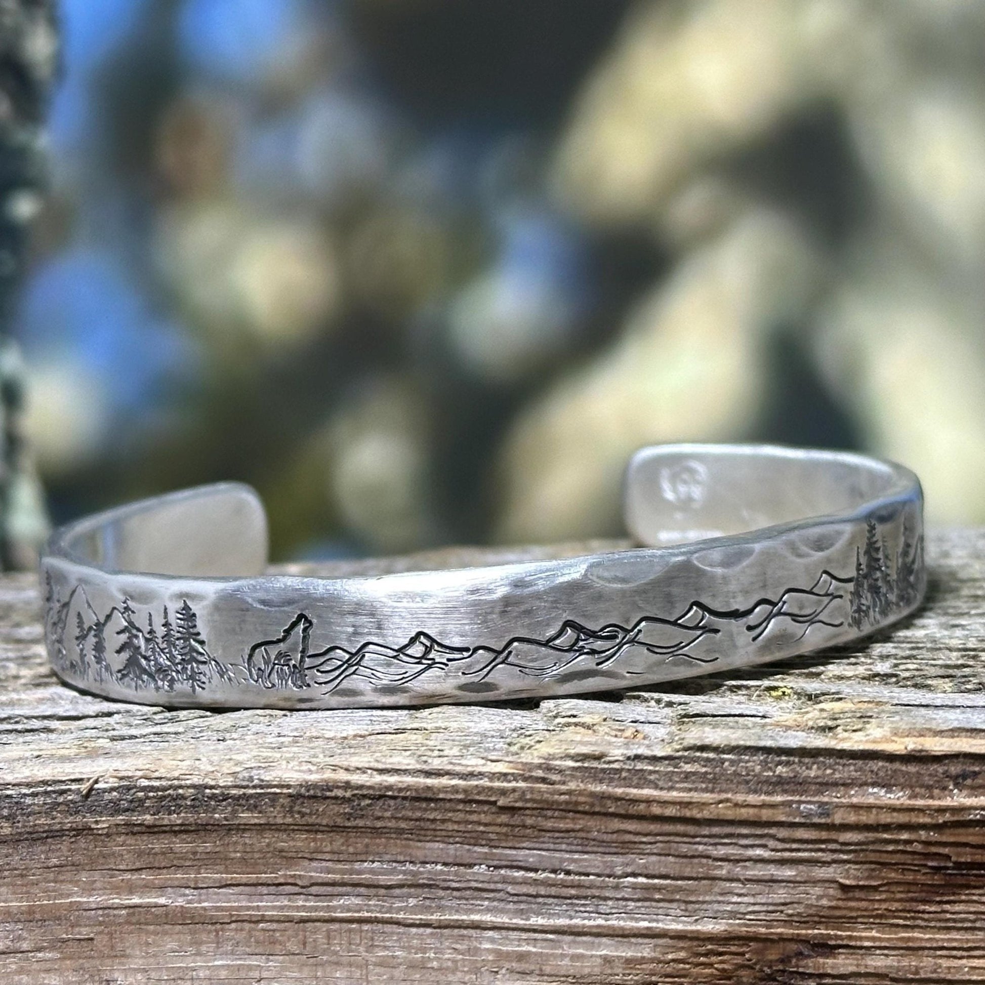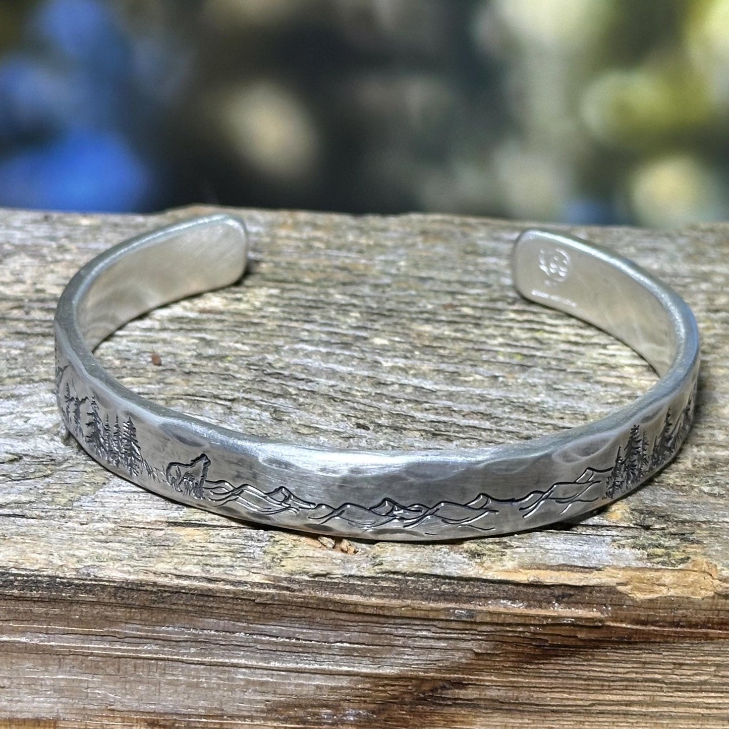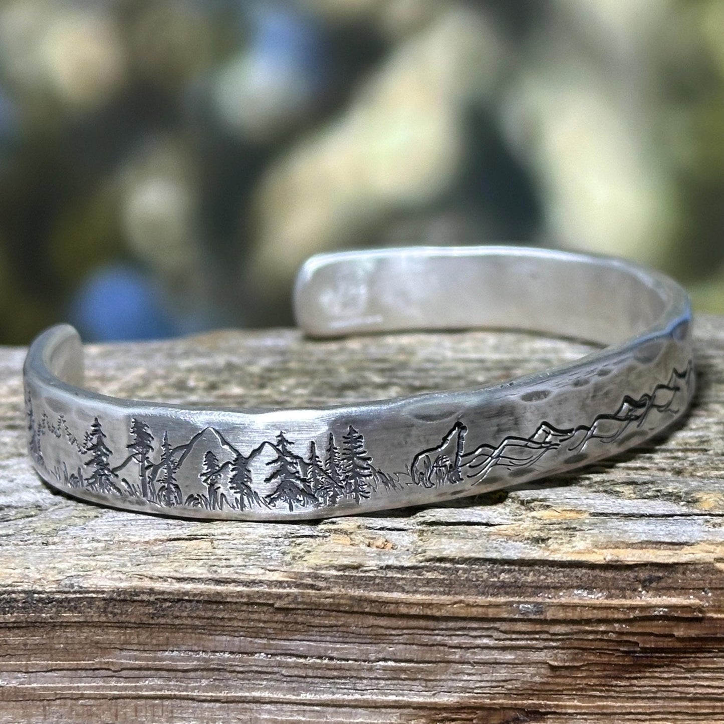Introducing the “Wolf Whisperer Cuff Bracelet” – the ultimate accessory for those who howl at the moon and dream of running wild with the forest’s finest! This bracelet is like a nature documentary on your wrist, featuring hand-stamped wolves, mountains, and trees that are so lifelike, they might just start a conversation with you.